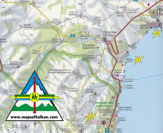Road network is clearly presented on a background with hill shading to show the topography. Names of main towns are in large size print to help navigating in unfamiliar area; within Bulgaria all place names are given in both Latin and Cyrillic alphabets. The map indicates various places of interest and facilities, including campsites, beaches, picturesque towns and villages, etc. 20 of the region’s best sights are prominently highlighted and cross-referenced to their descriptions in a separate booklet attached to the map cover. Latitude and longitude lines are drawn at 10’ intervals. The index is in the booklet and lists locations with their postcodes.